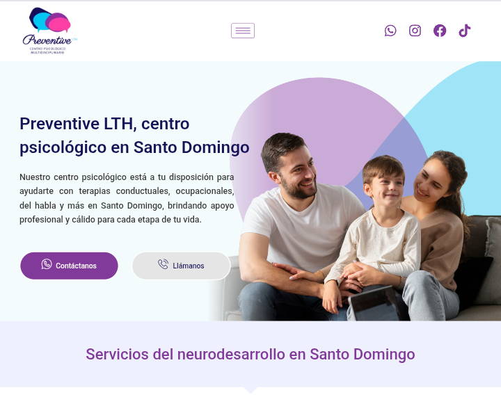Lorena Abreu pidió reflejar diversidad terapéutica. Creamos un diseño cálido y navegación sencilla para Preventive LTH, transmitiendo esencia humana auténtica y cercana.
